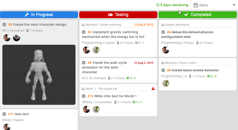We haven’t added any major feature during this release; instead, we have focused on several small improvements you requested many times, so I hope you are happy with the changes. Finally, we have added some keyboard shortcuts that will enhance your productivity. We still have many others to implement, but this first batch already makes both the board and the game model more usable. We also added due dates to tasks, which probably is your top requested feature. Although I don’t personally like adding deadlines to specific tasks inside a milestone (the iterations are delivered as a whole, where the order or internal deadlines are not really important), I understand other people find it very useful and I have to admit there are scenarios when I would like to have it too.