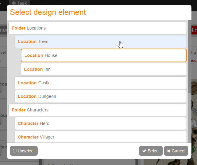 - Desing element change from the context menu: We have added a new entry to the context menu in order to be able to quickly change the game design element of a task without having to open the editor. A popup dialog appears where you can select the design element. This dialog will replace the design element selection on task creation and task edition, which is currently performed using a dropdown.