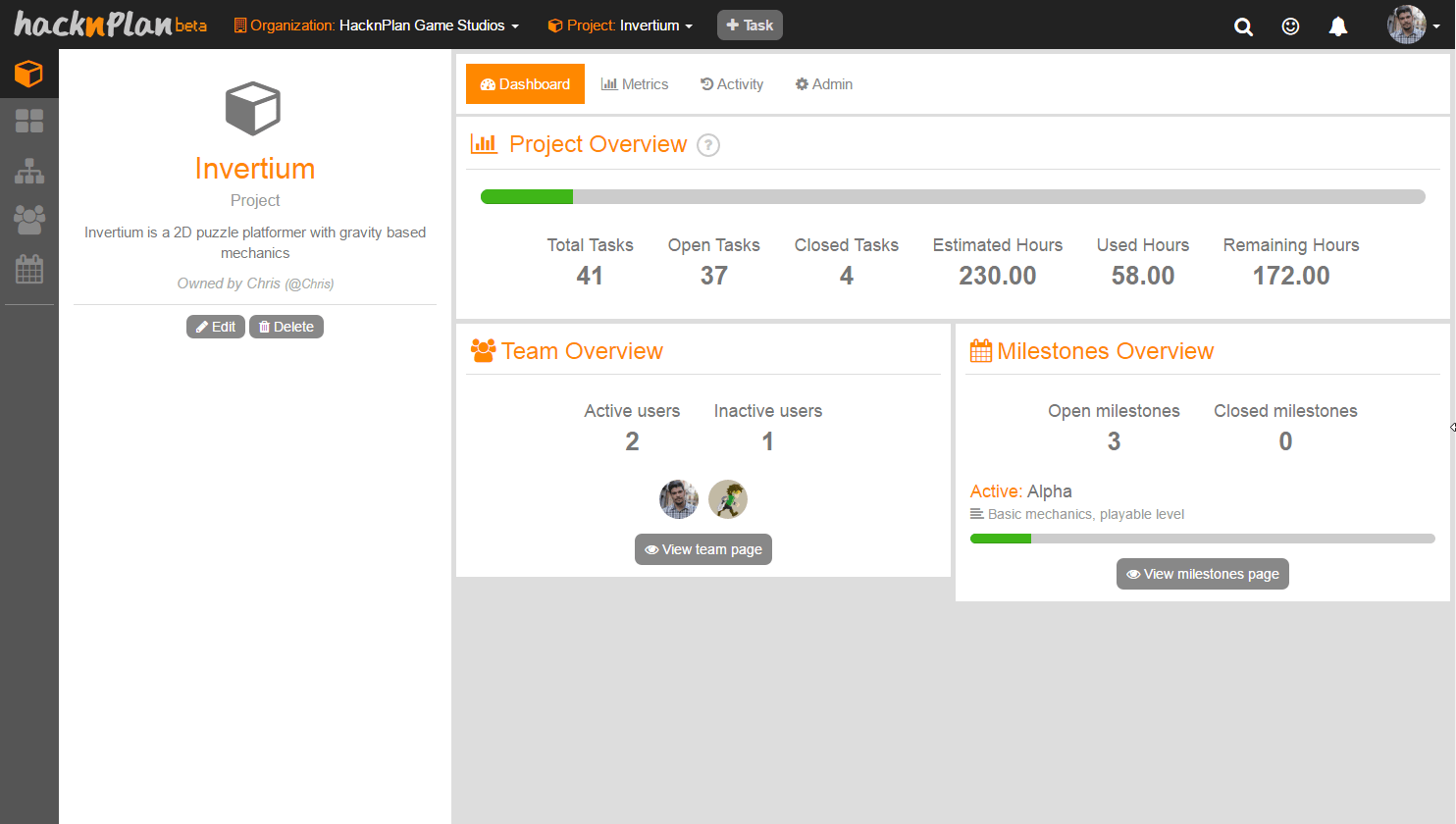 - Project page: The project page offers an overview of the project including progress and stats about the current status of the project, similar to what the Summary page offers but with a more brief description of the team members and the milestones (with links to the extended information). It also provides a tab for the general project metrics, one for the activity stream (not available yet), and another one for the project administration panels, which no longer have their own dedicated section.