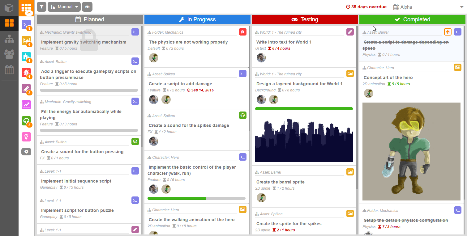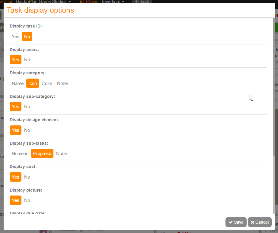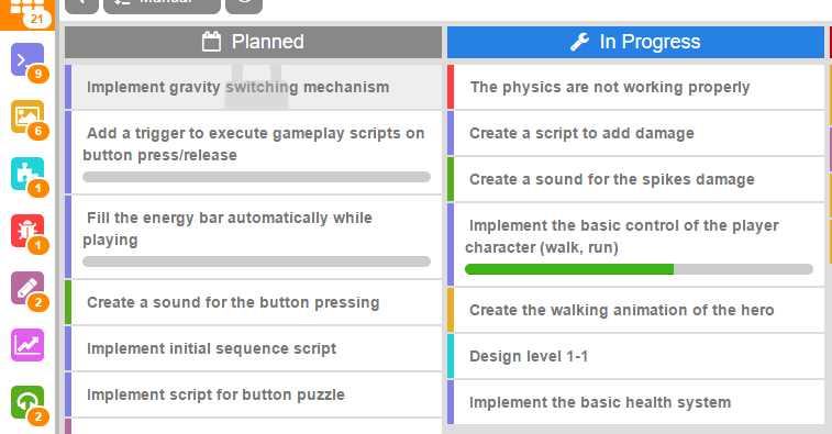 The users of HacknPlan Studio can now add their custom icons and colors to categories. This will make them stand out and be more recognizable at a glance. This also comes with an update on the boards: the category selector on the left side of the board displays icons only, making it smaller in width and giving out more space to task cards. The same applies to the category metrics. You can also see how the task cards show the icon instead of the name, being really easy to differentiate them now.