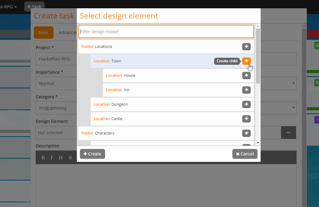 This may seem a small feature, but is one that can improve your productivity a lot. It’s common that you are creating a task and you realize the right design element does not exist. Before this improvement, you had to cancel the task creation, go to GDM section, create the new one, and then start the task creation again. Or just create the task without a design element and then update it later on. Now, this pain is gone. The design element selection dialog has buttons to quickly create a new element and assign it to the task automatically (either on the root of the tree or as a child of another element).