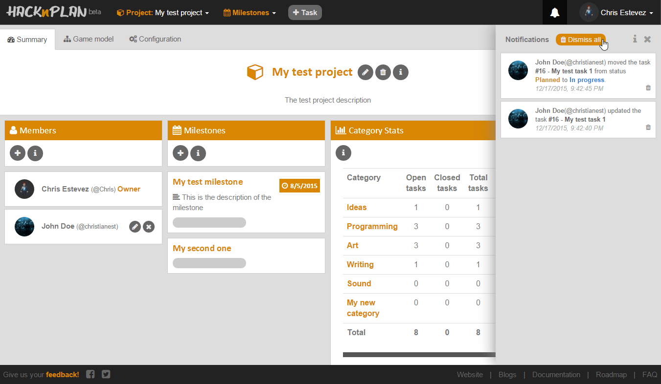I’ve been quite busy recently, mainly working on the notification system which is the main feature we are launching this week. It’s been quite a lot of work in the shadows to prepare the system for many new functionalities related to activity in HacknPlan. We are not only sending notifications to keep you updated about what’s going on in your projects, but also are starting to record many activity information that we will use very soon to provide you with a complete historical stream of activity. This will be very useful for several things, like checking the whole process of a task from creation to completion, extract statistics and data from your interaction with the tool, and many others.
