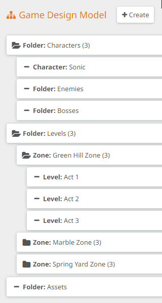 The top elements we created are all folders, meaning they are just containers of other elements. The first one, called Characters, is a container for the design of all the characters in the game. Inside it, we have an element for the main character Sonic (with its respective type) and also a few other folders, where we will have elements for the enemies and bosses of the game. You can also take a look at the Levels folder; we created three elements of the type “Zone”, equivalent to the three first zones of the original game, with three elements of type Level, corresponding to the three acts of each zone. Also, we created a folder called Assets, which will contain general assets of the game that are not specific to a level or zone, such as rings, checkpoints, springs…