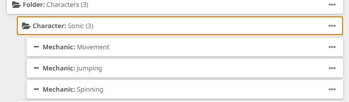 Now that we have this first layout of design elements, let’s focus on the Sonic character element for a moment. There is no right or wrong way to structure a design model, and you have to evaluate which method is better for your game, if you prefer fewer elements containing a lot of information, or subdivide them more and have smaller bits. In this example, I’ve decided to put all the player mechanics under the Sonic character for simplicity, but you could have also created a Mechanics folder and separated the mechanics from the character itself, either under it or at the root level.