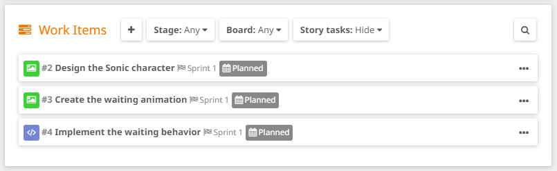 If we take the approach of building our game design model in a very detailed way, creating lots of levels and subelements, probably your last elements will define features. For instance, let’s go back to the Sonic example; in one of the examples, we created one child element per action the player can perform, such as moving, jumping, spinning… Following our advice, you would describe how it should work in the description of the element, and then create a few tasks linked to it such as “Create the jumping animation”, “Design the sound for jumping”, “Implement the jumping functionality”, and so on. But, if you read carefully how we defined user stories, we could just not create those elements per action, and just create some user stories like “Jumping”, “Spinning”… and assign them to the Sonic element directly. Those stories, most likely, would contain the tasks we mentioned before as story tasks. What’s better?