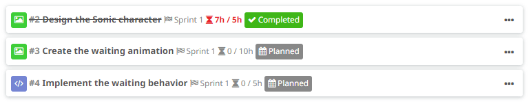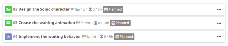 We created two art tasks, one for designing the character (obviously we all know what Sonic looks like but let’s assume we had to design it), and this cute animation of Sonic being impatient that is run when we don’t do anything for some time. Then, we also created a programming task to implement that waiting behavior, which basically runs the animation when x seconds have passed without player input. As you can see here, we could have just created a design element for the waiting feature, containing those two tasks, but we decided to add them to the character element directly, for simplicity.