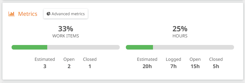 The 33% of work items (a work item is a unit of work, a task, or a user story) are closed and you can also see that 25% of the estimated hours are complete. Note that this value is calculated based on the estimation of the closed items, not the logged cost. This way, when you close all items, it will show a 100% completion even though it finally cost more than it was estimated. In that case, the Logged value will be displayed in red, indicating everything is closed but it wasn’t accurately estimated.