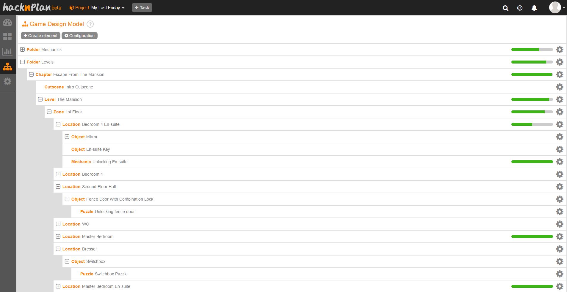 Not too long after starting the development on this project, I realized that the way I work is far from effective. So I started to spend more time on project management and seek after tools. First I used Trello but then I saw HacknPlan mentioned in a post on the Unreal Engine forums and it looked really promising. It is flexible and simple enough, yet has all the features that I need. The Game Design Model and the possibility that I can reference an element from it within a task makes this tool pretty unique and powerful.