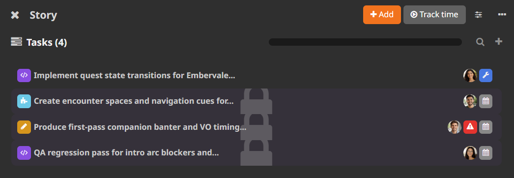 - assigning a user to a child task auto-adds them to the parent story