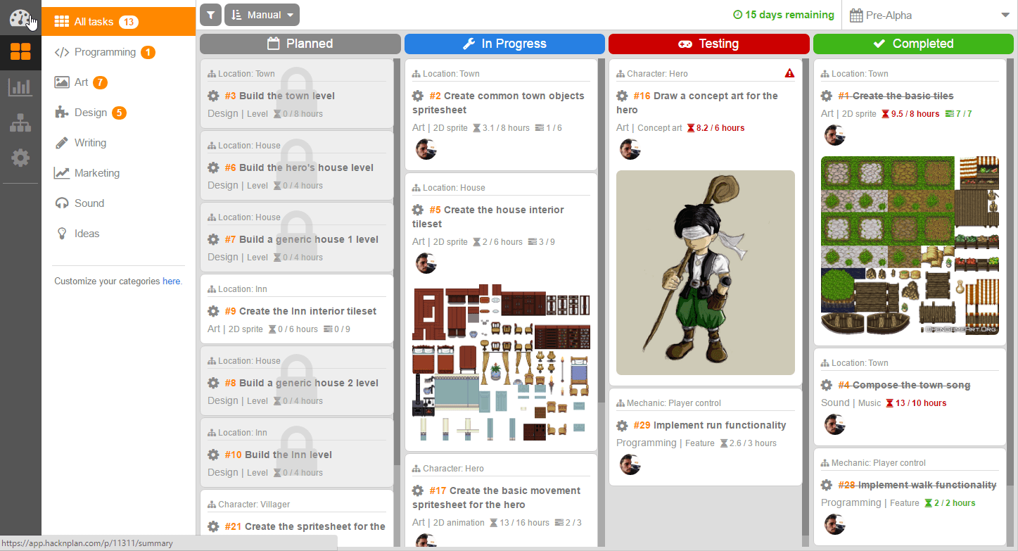 Up to this moment, no documentation nor guide has been delivered, except maybe those small tooltips giving some context to panels and buttons. From day one we tried to spend less on writing formal documentation which most of you won’t read, and spend more on thinking and iterating on the design of the application to make it as much self-explanatory and intuitive as possible. Although we believe it’s currently easy to pick up, it’s true that sometimes is unclear how the tool is supposed to be used. This ambiguity is somehow intentional, as we don’t want to be excessively rigid and allow you to use the tool if you already come with your own flavor of project management; however, it makes some of the features difficult to understand at a glance, specially the game design model. So, how can we teach you how to use the tool without writing a tutorial or a guide? The best way we came up with is HacknPlan RPG, our brand new demo project.