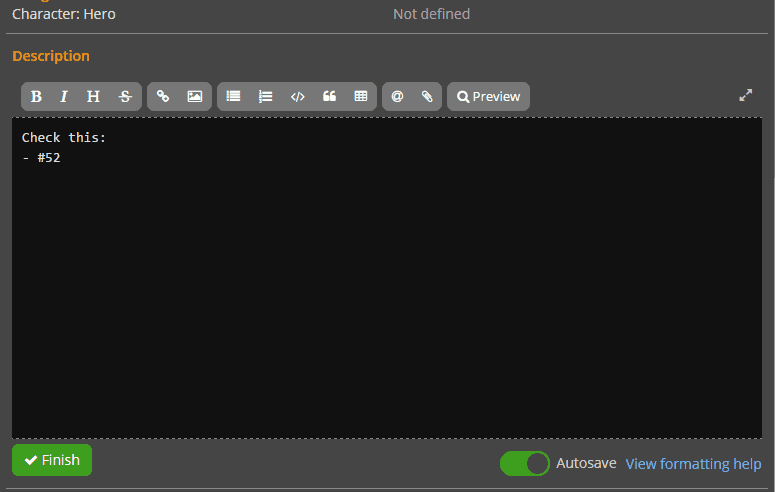 You can now reference tasks from markdown descriptions by writing # and the task ID (fi. #23), which will be rendered as a link to the task details. In order to help you find out the task ID you’re looking for, when you enter # on the markdown editor a list of tasks with autocomplete is displayed, so you just have to write a part of the task title, select with the directional keys, and press enter.